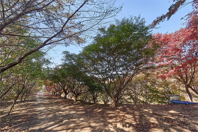 계절의 바뀜을 잊은 듯 오솔길 단풍나무는 아직 푸르다. 바로 옆 나무는 단풀이 들었다.