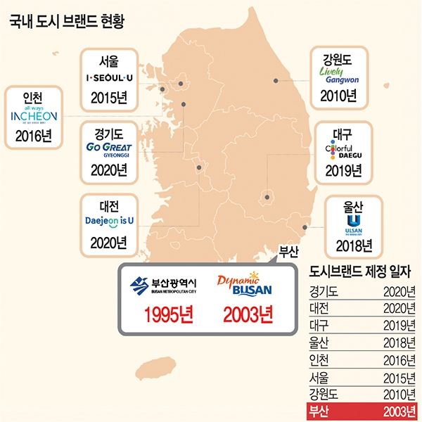 부산은 지난 1995년 3월 만든 심벌마크를 27년째, 2003년 11월 제정한 ‘다이나믹 부산’ 슬로건을 20년 동안 사용 중이다.
