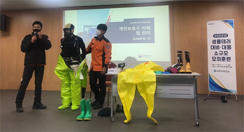 이번 훈련은 화생방 전문가의 생물테러 위협 및 초동조치 교육과 보건소, 소방서, 경찰서 직원으로 구성된 초동조치팀을 대상으로 한 실습형 훈련 형태로 진행됐다.