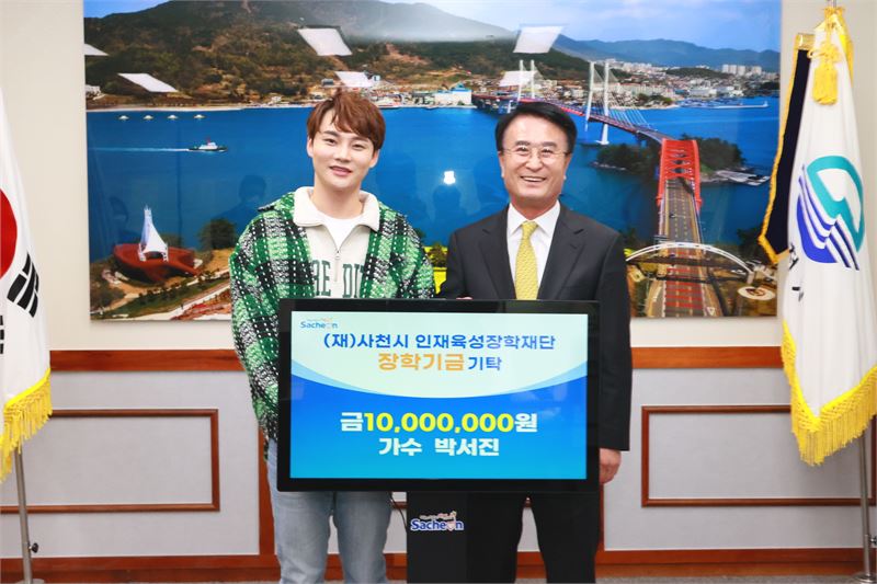 박서진은 16일 경남 사천시청을 방문해 지역인재 육성을 위해 써 달라며 (재)사천시 인재육성장학재단 박동식 이사장(사천시장)에게 장학금 1000만원을 전달했다.