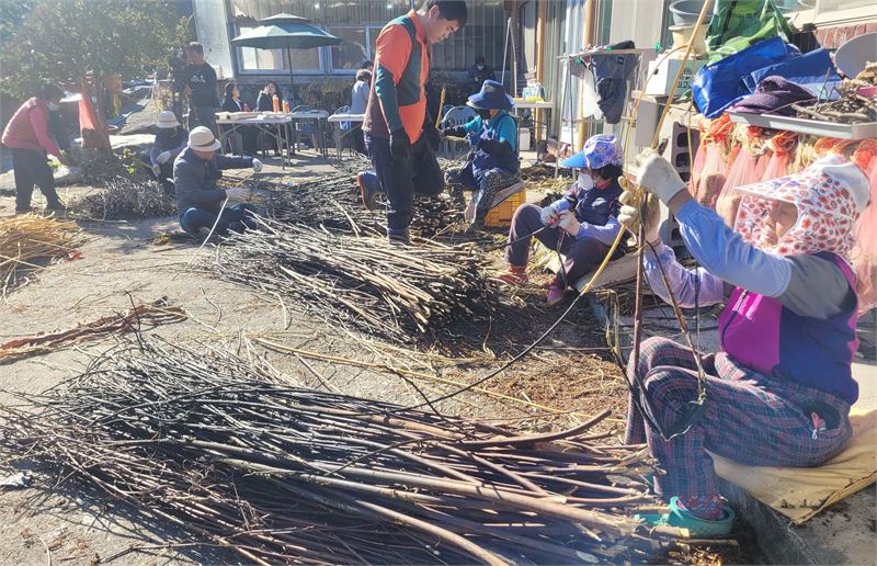 주민들이 벗긴 닥나무 껍질의 바깥 부분을 다시 벗겨내고 있다. 질긴 하얀 속껍질만 남겨한지 재료로 사용한다. 이상 함양군 제공