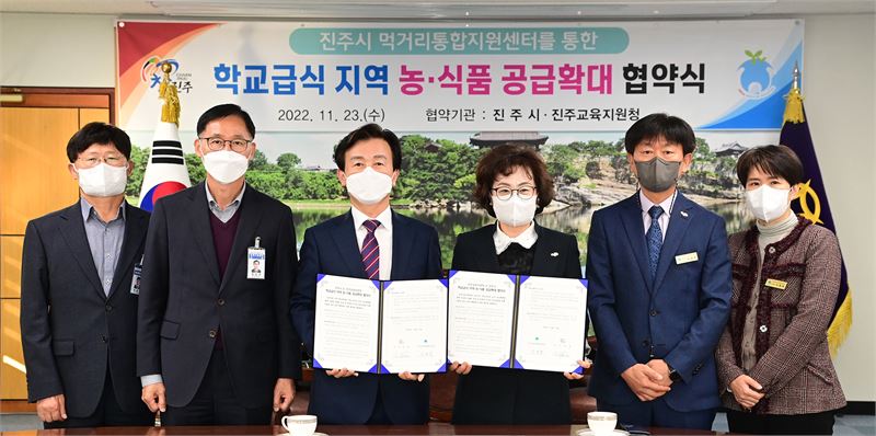경남 진주시는 진주교육지원청과 23일 시청 기업인의 방에서 학교급식에 지역에서 생산되는 농·식품 공급을 확대하기 위한 업무협약을 했다.