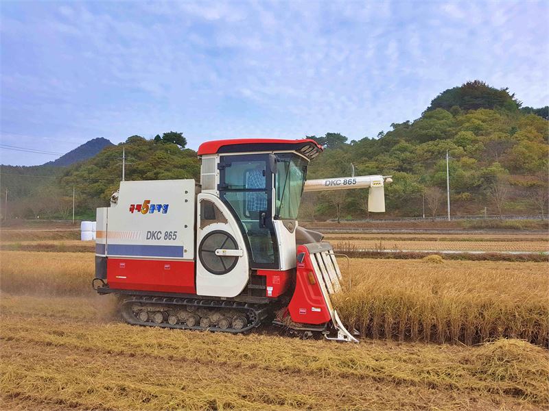 경남의 한 농민이 콤바인으로 벼논에서 추수를 하고 있다. 정창현 기자