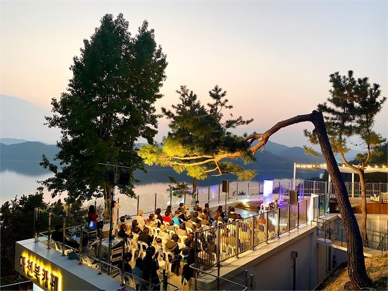 지난 11월 진양호 아천 북카페 루프탑에서 가을 저녁 노을을 배경으로 '노을음악회'가 열리고 있다. 이상 진주시 제공