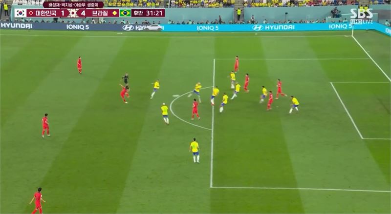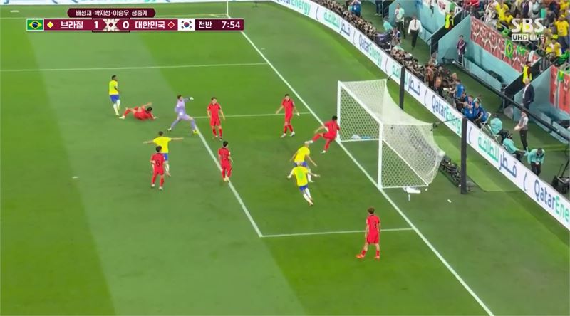 한국은 경기 시작 후 7분 만에 브라질의 개인기에 당황하며 수비가 속수무책으로 뚫리면서 비니시우스 주니오르(스페인 레알 마드리드)에게 선제골을 내줬고, 13분에는 네이마르(프랑스 파리 생제르맹)에게 페널티킥으로 추가 골을 빼앗겼다.