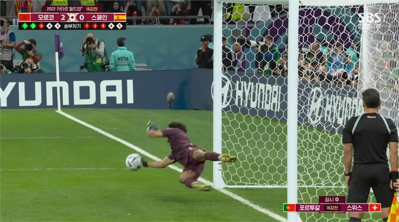 모로코 골키퍼 부누가 승부차기에서 공을 막아내는 장면