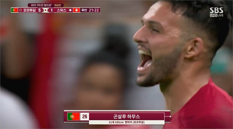포르투갈의 곤살루 하무스 선수가 헤트트릭을 기록하고 환호를 하고 있다.