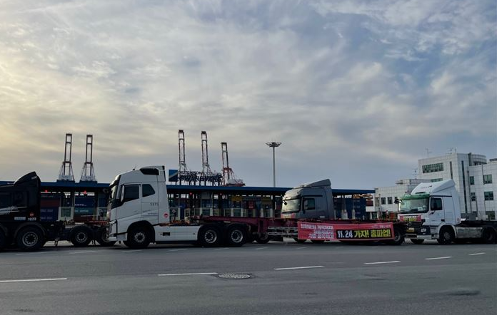 지난달 29일 전남 광양항 근처에 멈춰서 있는 화물트럭들. 화물연대 집단운송거부 사태로 물류난이 심각해지자 정부는 이날 시멘트 분야에 업무개시명령을 내렸다. 독자 제공