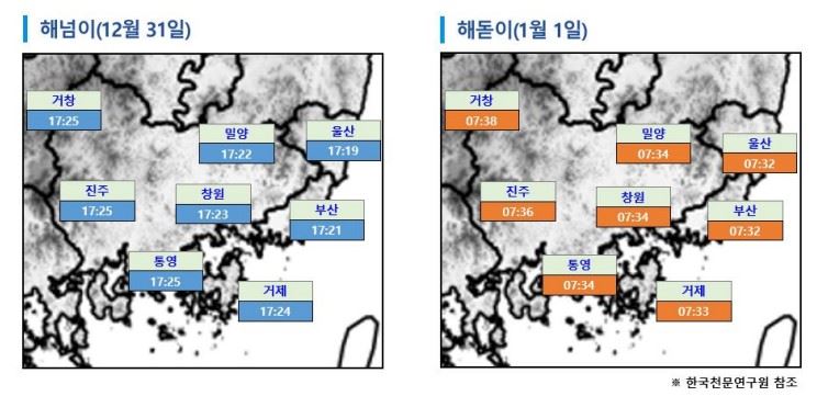 * 주요 지점의 해넘이(12월 31일)와 해돋이(1월 1일) 시각/ 출처 한국천문연구원(astro.kasi.re.kr)