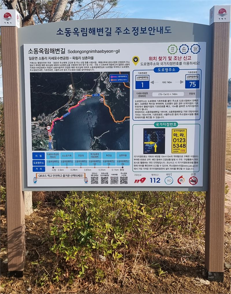 이번 사업으로 도로명이 없던 해변 데크길, 해수욕장, 물양장, 방파제에도 도로명이 새롭게 부여됐다. 또 주소가 없어 찾기 어려운 간이화장실, 인명구조함, 쉼터, 전망대, 캠핑장, 낚시공원에도 도로명주소를 부여하고 안내 시설을 설치했다.