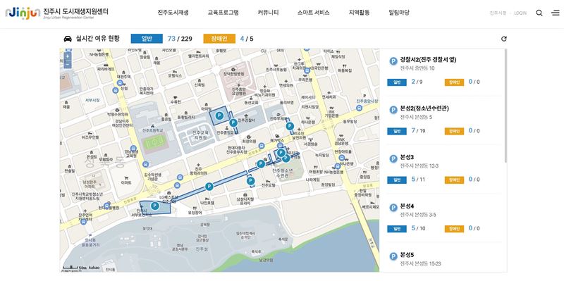 경남 진주시는 성북지구 도시재생사업으로 스마트교통서비스인 스마트주차장을 성북지구 내 4곳에 설치 완료하고 실시간 주차정보를 제공하는 시범서비스를 하고 있다.