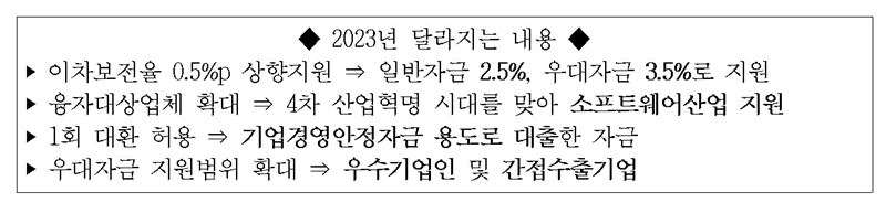 최근 고금리, 고물가, 고환율의 삼중고를 겪고 있는 기업인들을 위해 이차보전율을 상향 지원하고, 기존 제조업에만 제한되었던 융자대상업체를 소프트웨어 산업분야까지 확대했다. 특히 기술·신용보증기금으로 기업경영안정지금 용도로 대출한 자금을 1회에 한해 대환(기존채무를 변제하기 위해 현실적인 자금의 수수 없이 서류상으로만 신규대출해 이를 기존채무와 상계하는 것을 말한다) 허용하기로 했다.