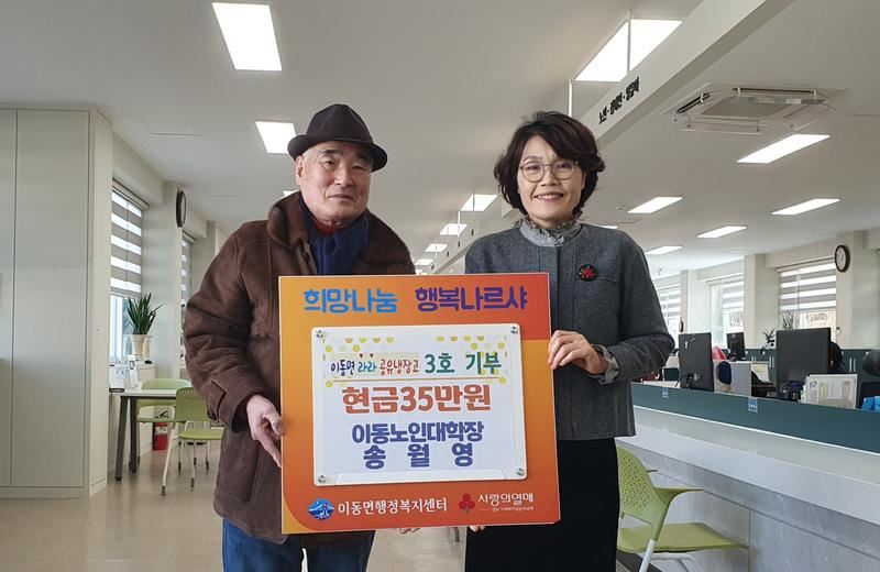 지난 설날 전 가온건설 박철표 대표의 김·두부세트 기부를 시작으로 박기동 초곡이장이 현금 30만원을 기부한데 이어 지난 27일에는 전 이동노인대학장 송월영 씨가 35만원을 기탁해 3호 기부자로 이름을 올렸다.
