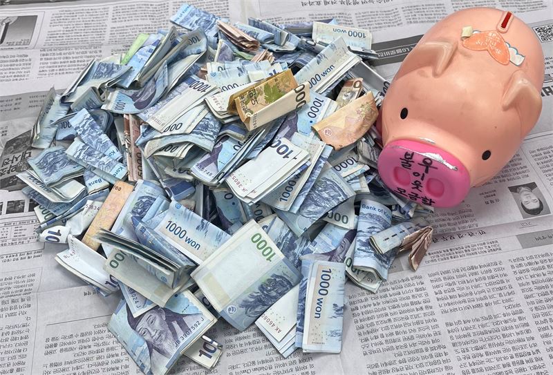 합천터미널다방 사장 차민영 씨가 저금통을 다방의 카운트에 두고 손님 등과 함께 모아온 꼬깃꼬깃한 지폐들. 합천군 제공