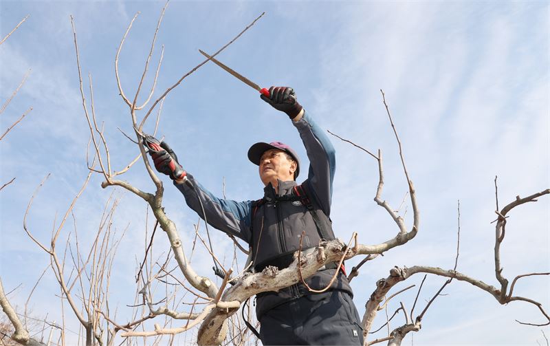 포근한 날씨를 보인 7일 경남 함양군 병곡면 감 과수원에서 하종희 씨가 고품질 과실 생산을 위해 감나무 가지치기(전정·剪定)를 하고 있다.