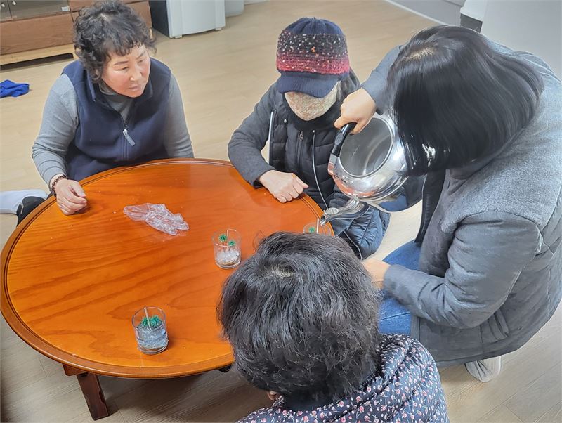 이번 경로당 프로그램은 실내 마스크 완화로 경로당 활성화에 따라 어르신들의 치매 예방과 건강증진에 기여하고자 기획됐다. 경로당의 어르신들이 직접 젤 왁스 녹이기부터 향초 심지 세우기까지 미니 어항 모양의 젤리 향초를 만들어 보는 시간을 가졌다.