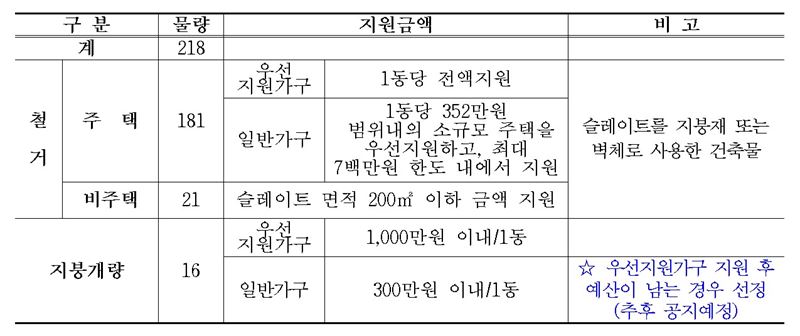 슬레이트를 지붕재 또는 벽체로 사용한 주택 및 비주택(축사,창고) 건축물이 대상이다. 이 사업에 국‧도비를 포함한 사업비 총 8억 5000만 원을 확보해 총 218가구 건축물의 노후 슬레이트의 철거·처리를 지원한다.