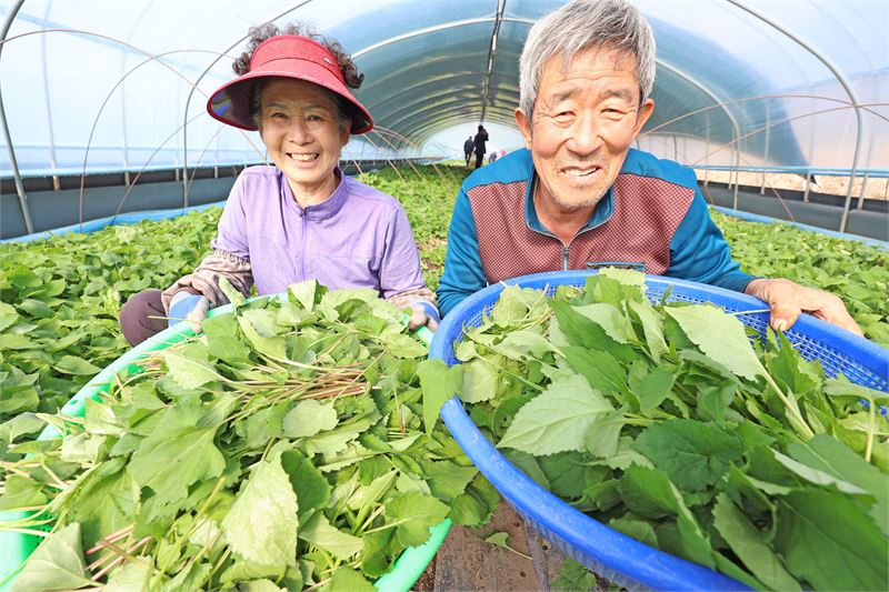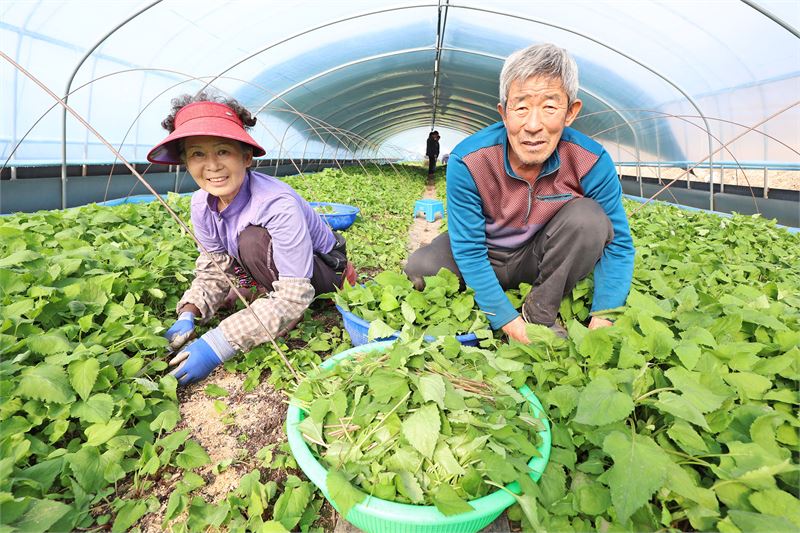 홍석현-우윤순 부부가 갓 수확한 취나물을 들어보이고 있다.