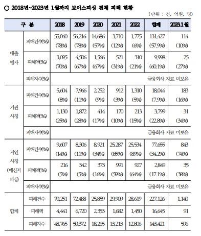 5년간 발생한 유형별 보이스피싱 피해는 대출 빙자 13만 1427건(57.9%, 9998억원)으로 가장 많았으며 다음으로 메신저 피싱(지인 사칭)이 7만 7655건(34.2%, 2849 억원), 기관 사칭 1만 8044건(7.9%, 3799억원) 순이다 .