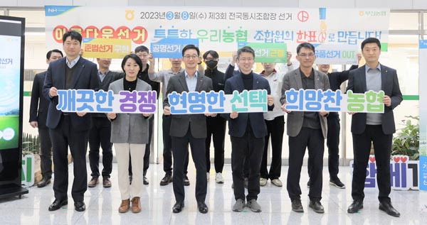 28일 농협중앙회 부산본부 임직원들이 회의실에서 전국동시조합장 ‘공명선거 실천 캠페인’을 하고 있다. 농협중앙회 부산본부 제공