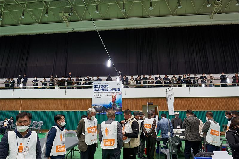 조합장 후보들의 참관인들과 관람객들이 8일 경남 진주시 문산실내체육관 개표장에서 개표 과정을 주시하고 있다. 정창현 기자