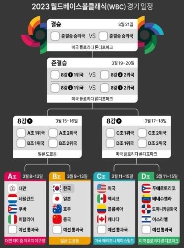 한국은 제1회 WBC에서 4강 진출, 2회 WBC에서는 준우승을 차지했다. 하지만 3회와 4회 대회에서는 1라운드에서 탈락했었다.