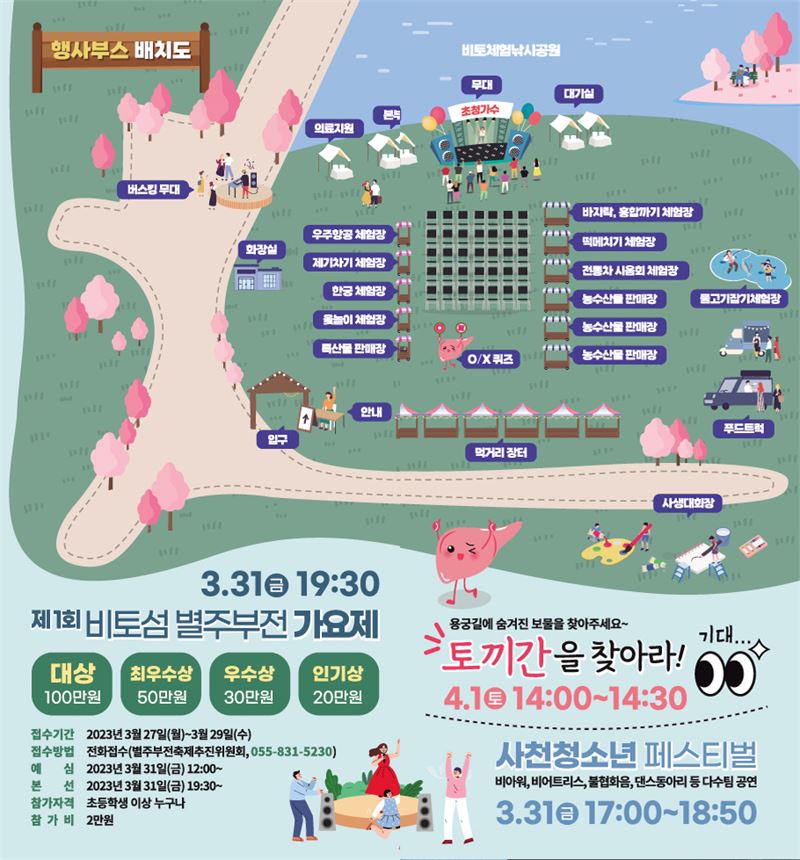 특히 올해는 제1회 비토섬별주부전가요제를 연다. 예심은 첫날인 31일 낮 12시, 본선은 저녁 7시 30분 진행된다.