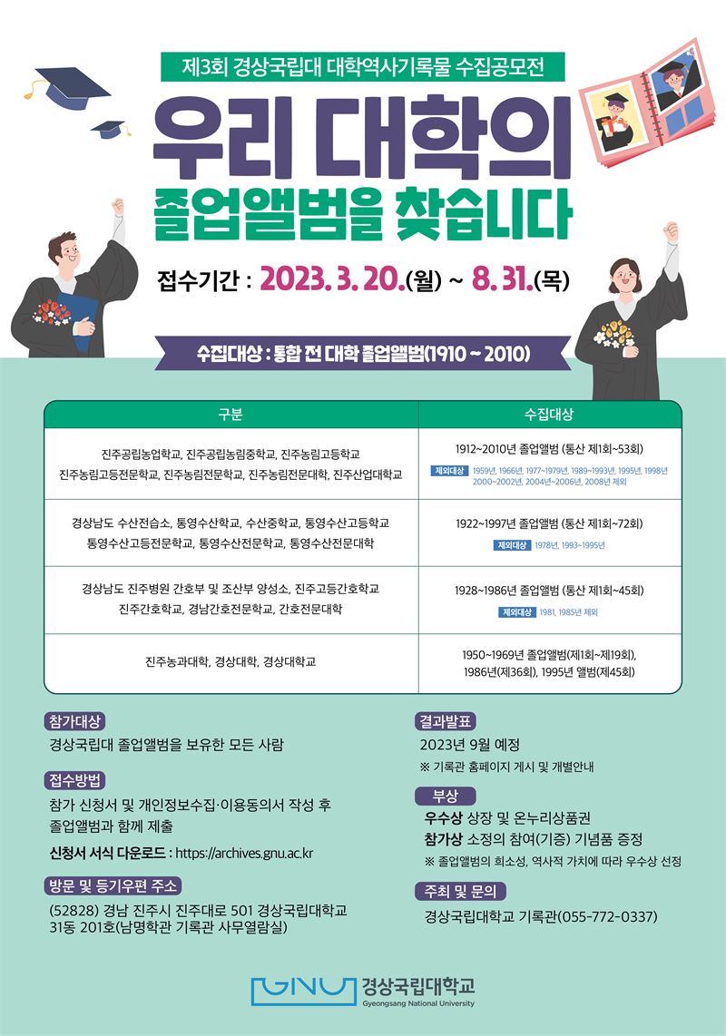 경상국립대(GNU)는 '우리 대학의 졸업앨범을 찾습니다'를 주제로 ‘제3회 대학역사 기록물 수집공모전’을 개최한다. 오는 8월 31일까지 참가 신청을 받는다.