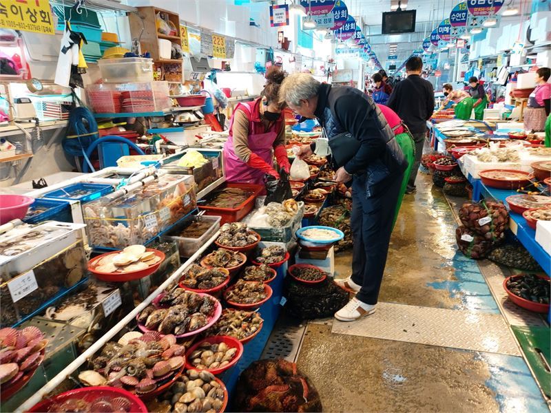 경남 사천시 삼천포용궁수산시장에서 손님이 수산물을 구입하고 있다. 정창현 기자