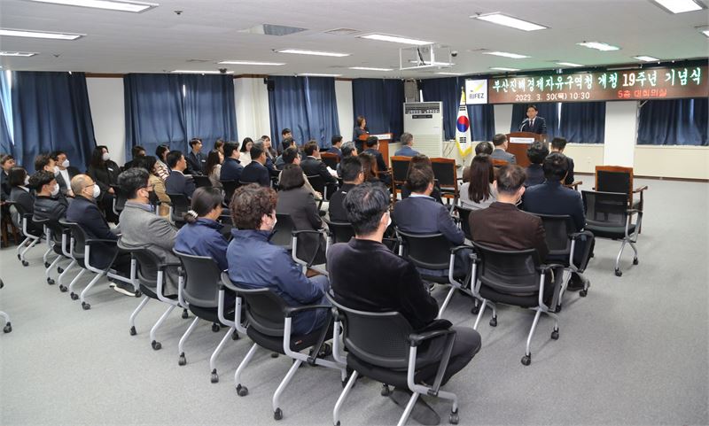 '세계최고 물류·비즈니스 중심 실현'을 비전으로 문을 연 부산진해경제자유구역청이 개청 19주년을 맞아 30일 청사 5층 대회의실에서 개청 19주년 기념행사를 개최했다.