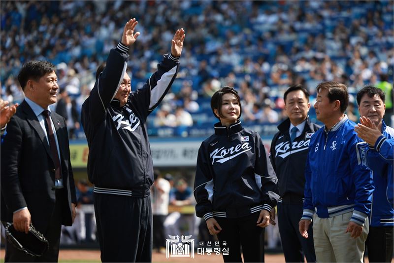 야구 국가대표팀 점퍼를 착용한 윤 대통령은 김건희 여사와 함께 그라운드에 나와 관중에게 인사한 뒤 허구연 KBO 총재와 함께 마운드에 올라 개막을 알리는 공을 던졌다.
