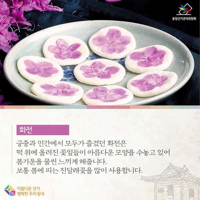이날엔 쑥떡, 화전, 창면, 화면과 진달래로 빚은 두견주 등의 음식을 마련해 나눠먹었습니다.