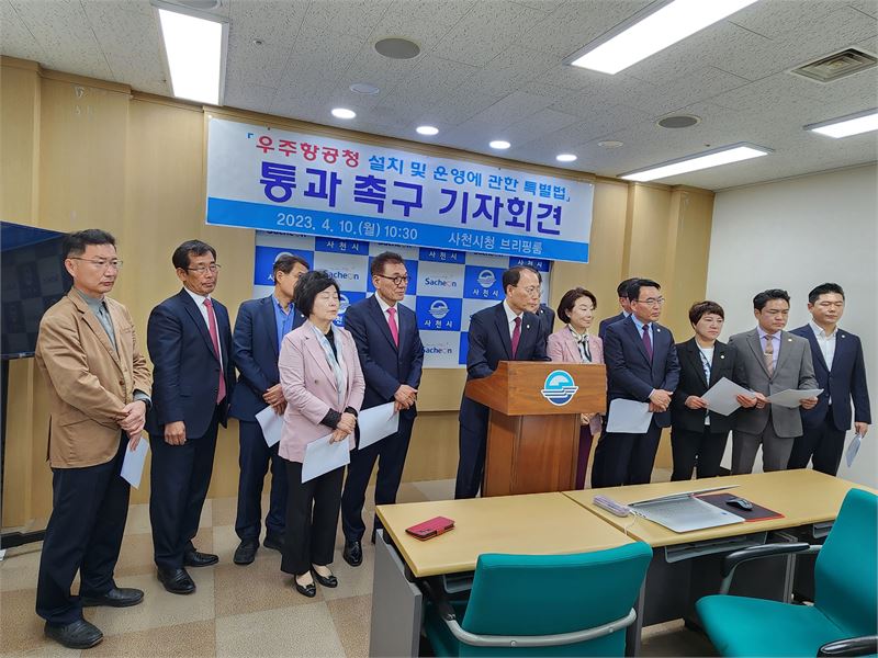 경남 사천시의회(의장 윤형근)는 10일 시청 2층 브리핑룸에서 의장을 비롯한 12명의 시의원이 참석한 가운데 ‘우주항공청 설치와 운영에 관한 특별법’의 국회 통과 촉구 기자회견을 가졌다.