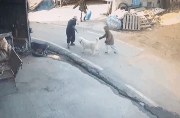 아이와 함께 산책을 하던 흰 개가 중년 여성에게 달려들려고 한다.