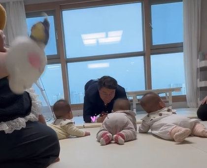 네쌍둥이를 흐뭇하게 바라보는 최정우 포스코그룹 회장. 네쌍둥이 엄마 박두레 씨 인스타그램 캡처