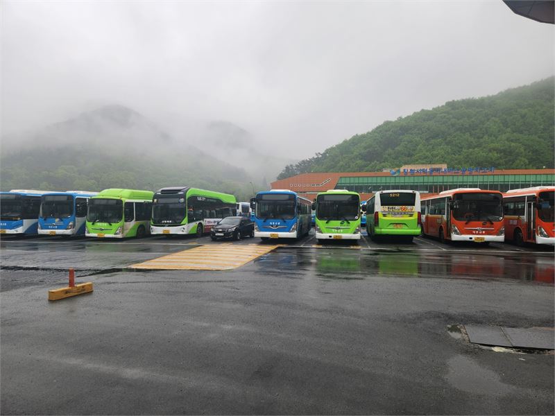 19일 오후 경남 창원시 덕동 시내버스 공영차고지에서 시내버스가 운행을 중단한 채 정차해 있다. 독자 정재송 씨 제공