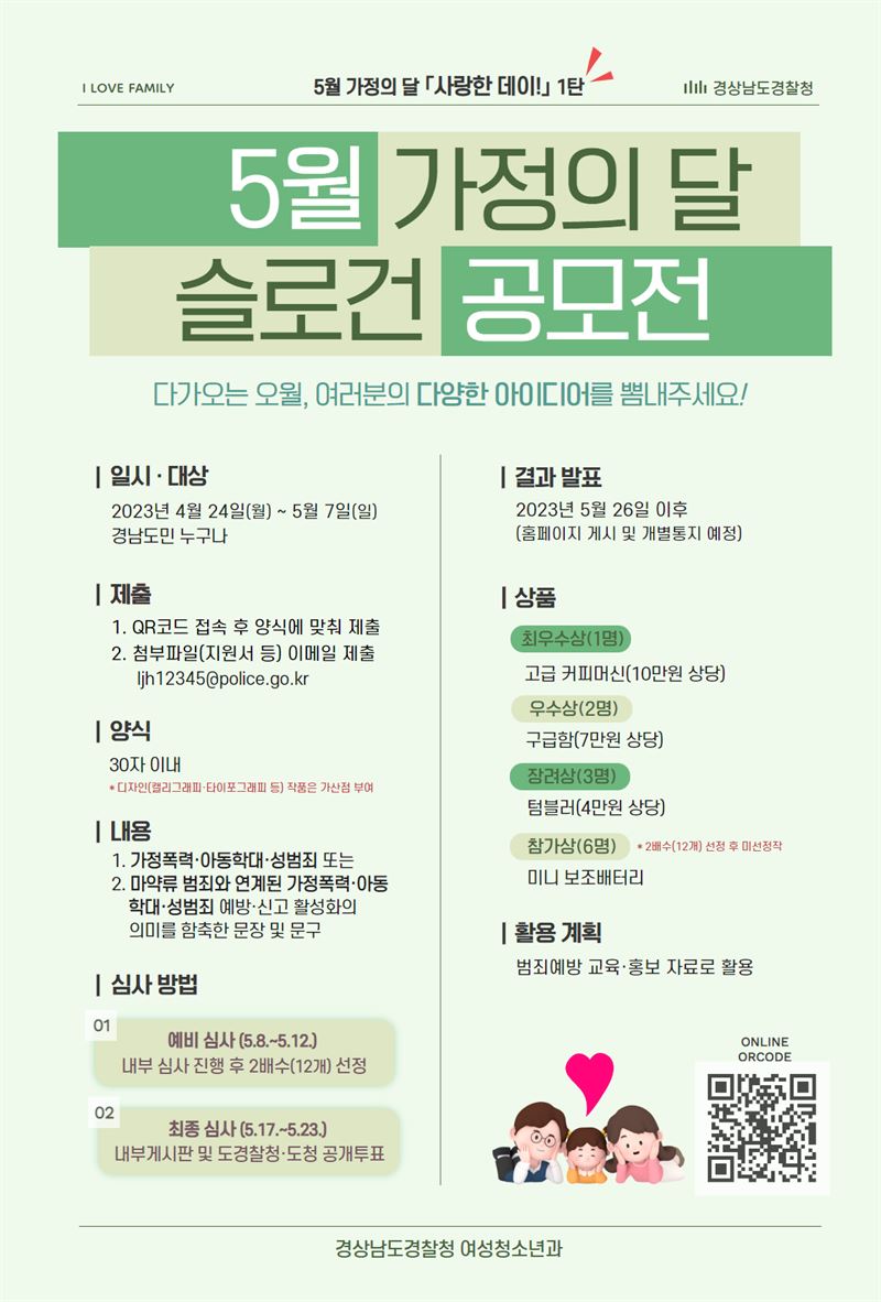경남도경찰청은 가정의 달 5월을 맞아 최근 이슈가 되고 있는 마약류 범죄와 여성·가정 등 사회적 약자 보호를 주제로 한 공모전과 지원사업인 '사랑한 데이!'를 진행한다고 밝혔다.