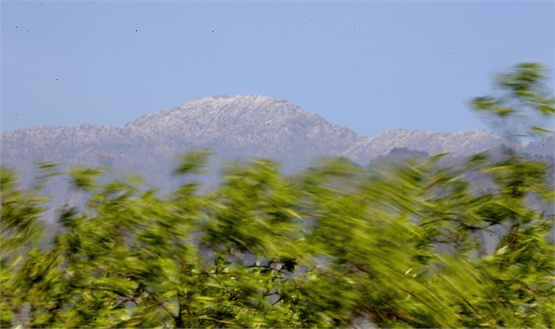 세찬 바람에 휘날리고 있는 초록 나뭇잎과 대비된 하얗게 눈 덮인 지리산 천왕봉 모습. 이 세상과 저 세상의 모습처럼 이채롭다. 이상 함양군 제공