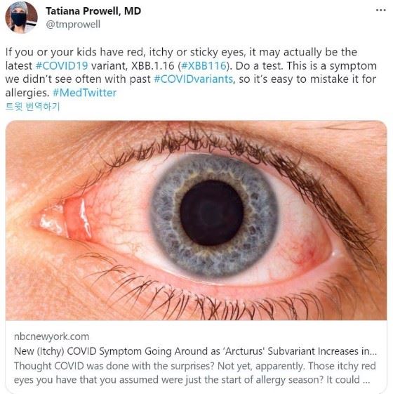 미 존스홉킨스의대 타티아나 프로웰 교수는 “만약 눈이 충혈되고 가렵거나 끈적인다면 XBB.1.16일 수 있다”며 “알레르기로 오해해 넘어가지 말아야 한다”고 당부했다. /트위터
