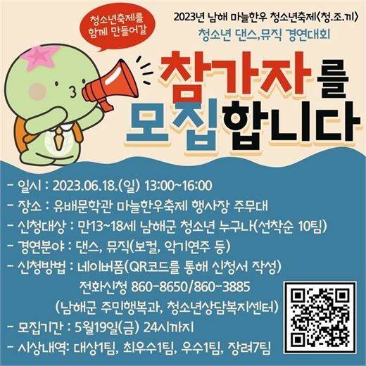 경연대회 참가 희망자는 남해군 주민행복과 아동청소년팀(055-860-8650)이나 남해군청소년상담복지센터(055-860-3885)로 문의하면 된다. 학교나 이메일 등을 통해서도 신청이 가능하다.