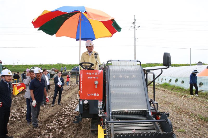 이날 행사에서는 마늘 일관 기계화 재배모델 설명을 시작으로 ▲방제용 드론 ▲마늘줄기 절단기 ▲굴취 수확기 ▲마늘 수집기 등 마늘 기계화 기종을 전시하고, 현장에서 마늘 수확 과정을 직접 선봬 참석자들의 큰 호응을 끌어냈다.