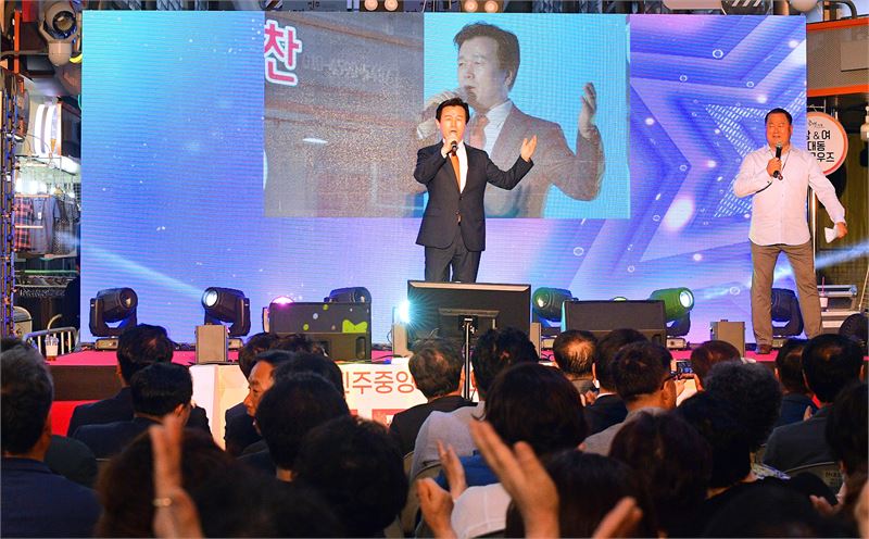 조규일 진주시장이 진주 전통시장 트로트 페스티벌 행사에서 인사말을 하고 있다. 진주시 제공