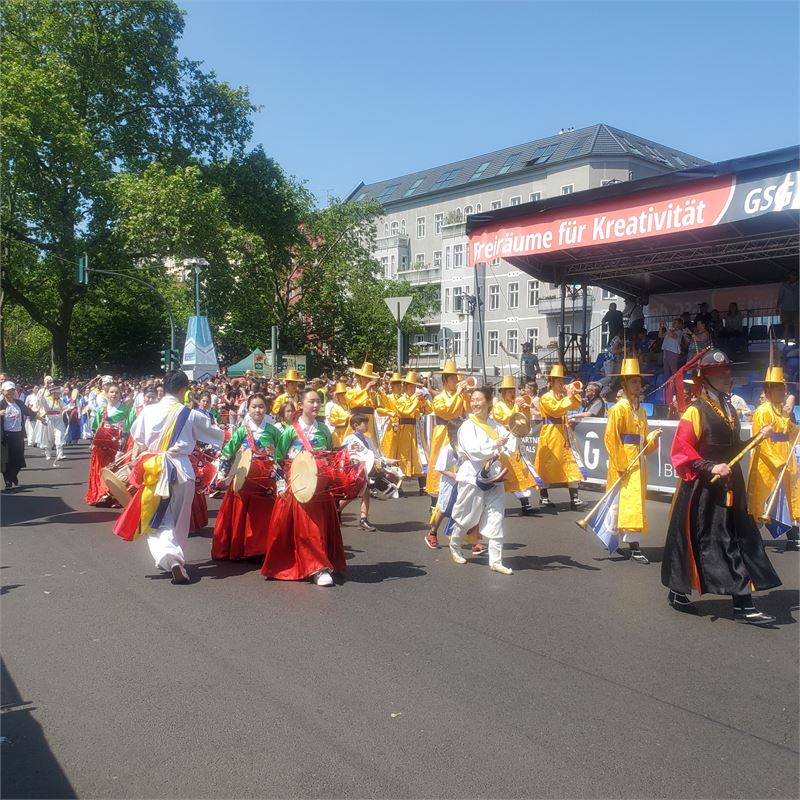 진주성 취타대의 나발과 태평소가 행진대를 이끌고 북과 장구, 꽹과리가 그 뒤를 따랐으며 황금빛 의상과 시원하면서도 오묘한 태평소 소리가 관람객들의 눈과 귀를 동시에 휘감았다. 이어 베를린에 거주하고 있는 한인 3세들과 주재원 2세들이 장단에 맞추어 부채춤을 추면서 뒤를 이었는데 이는 굉장한 장관을 연출해 축제에 참가한 세계 모든 관람객들에게 찬사를 받기도 했다.