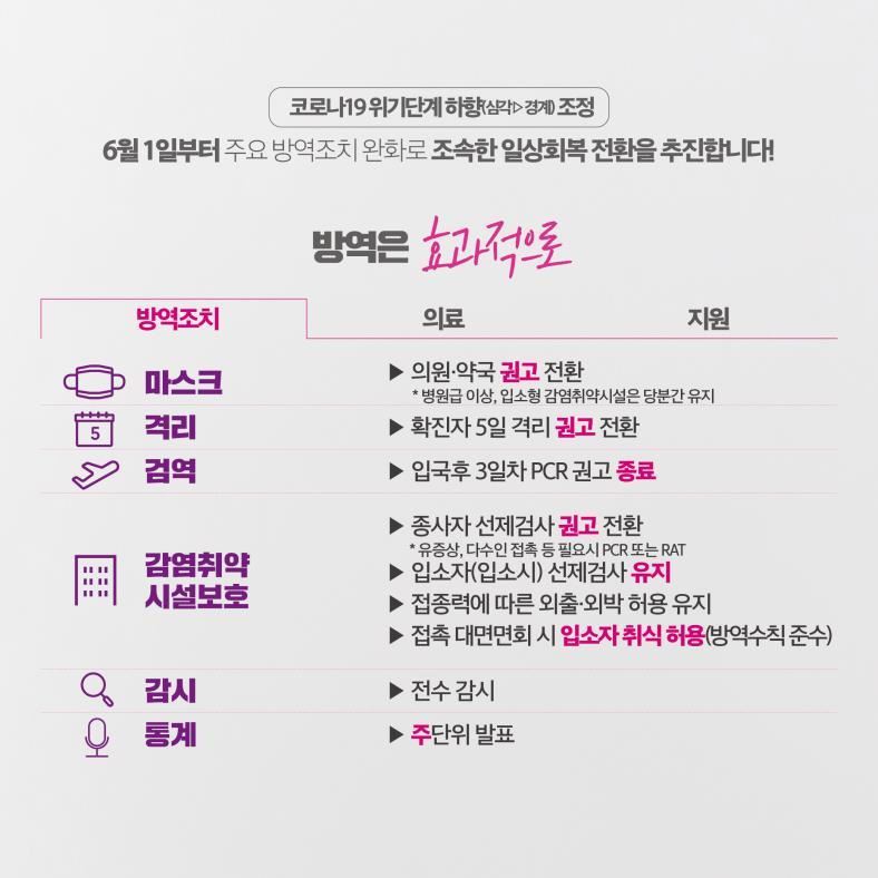 중앙재난안전대책본부는 오는 6월 1일부터 코로나19 위기경보 수준을 '심각'에서 '경계'로 하향 조정했다. 질병 위험도 하락과 안정적인 방역 상황, 세계보건기구(WHO)의 공중보건 위기 상황 해제 발표(지난 5월 5일) 등을 종합 고려했다.