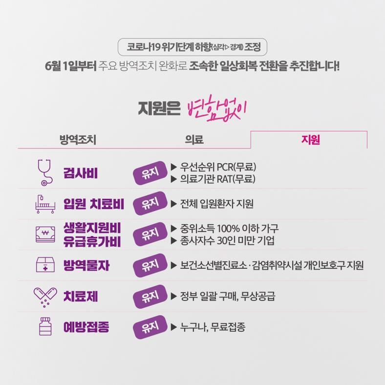 또 입원 치료비, 예방 접종, 치료제, 격리지원금(생활지원비, 유급휴가비) 등 지원체계도 당분간 유지함으로써 시민의 부담을 줄인다.
