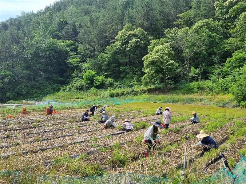합천군 율곡면사무소 직원들이 7일 율곡면 와리 양파 재베 농가에서 일손을 돕고 있다.