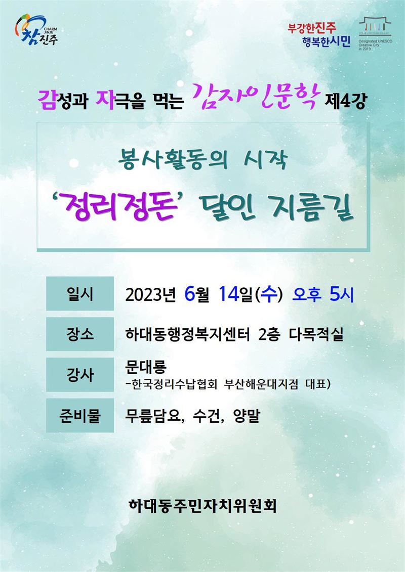 경남 진주시 하대동 주민자치위원회(위원장 박재병)는 오는 14일 하대동 행정복지센터다목적홀에서 문대룡 정리수납 전문가를 초청해 감성과 자극을 먹는 ‘감자인문학’ 제4강을 연다.