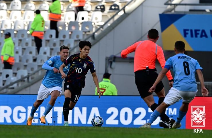 한국은 이날 이영준을 최전방 스트라이커로 놓고 배준호와 이지한이 측면 공격수로 뒤를 받쳤다.