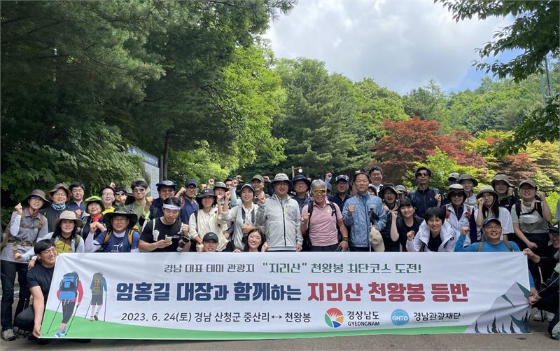 경남도와 경남관광재단은 24일 전문 산악인 엄홍길 대장과 경남도 SNS·대학생기자단, 경남도 산악회 등 40여 명과 함께 지리산 천왕봉을 최단거리로 오를 수 있는 코스로 지리산 등반 홍보 이벤트를 진행했다.