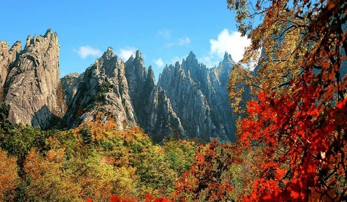 금강산 가을 정취. 계절마다 금강산이 보여주는 풍경이 각각 달라 봄에는 금강산(金剛山), 여름에는 봉래산(蓬萊山), 가을에는 풍악산(楓嶽山), 겨울에는 개골산(皆骨山)으로 부른다. 조선중앙통신